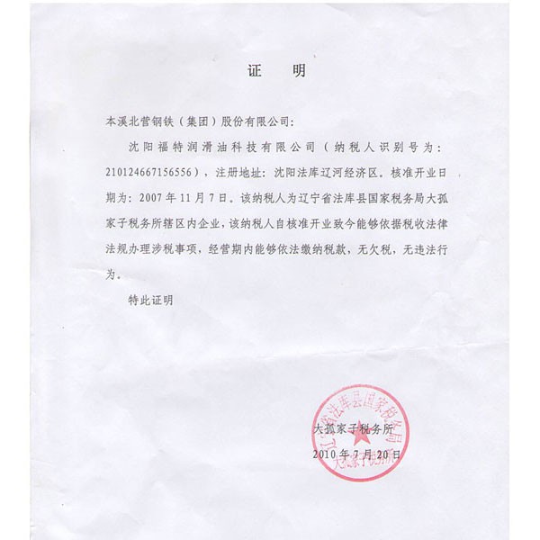 证书编号: 0002 证书名称: 纳税证明 发证机构: 辽宁省法库县国家税务局 生效日期: 2007年11月07日 截止日期: 2010年07月20日 认证简介: 沈阳福特润滑油科技有限公司纳税证明