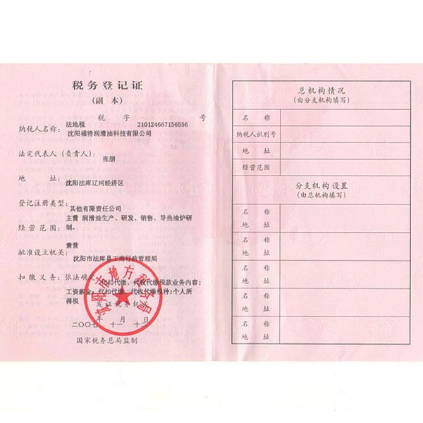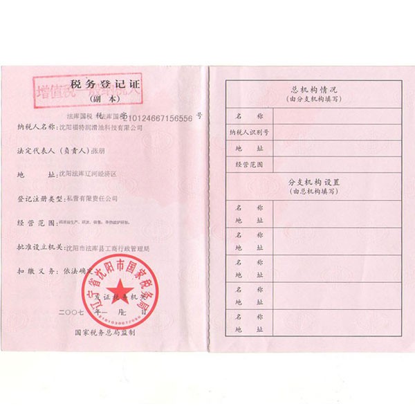 证书编号: 0004 证书名称: 税务登记证 发证机构: 辽宁省沈阳市国家税务局 生效日期: 2007年11月07日 截止日期: 2011年11月07日 认证简介: 沈阳福特润滑油科技有限公司税务登记证