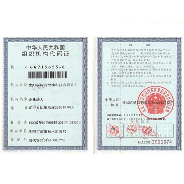 证书编号: 0005 证书名称: 组织机构代码证 发证机构: 质量监督检验检疫总局 生效日期: 2007年10月30日 截止日期: 2011年10月30日 认证简介: 沈阳福特润滑油科技有限公司组织机构代码证