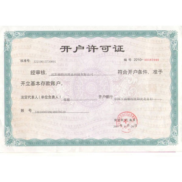 证书编号: 0006 证书名称: 开户许可证 发证机构: 中国人民银行 生效日期: 2007年11月20日 截止日期: 2011年11月20日 认证简介: 沈阳福特润滑油科技有限公司开户许可证